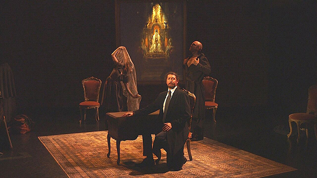 At the back of the stage is a large portrait of The Master, enclosed within a framed screen, with projection design by Jeremy Mimnagh. As we enter, this portrait looms, one eye lit in an observing stare. Gradually, the image on the screen transforms into birds, a leafless tree, art objects, flowers, his library-- until all becomes more and more abstract and ends with a stark figure, "his face is like clay, lips bloated and dry." We last see The Master on the verge of going back to civilization, where he muses: