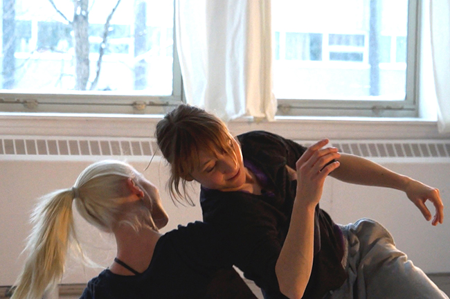 The Four Seasons is an exploration of winter, spring, summer, and fall in dance. Two dancers, Blumberg and Jillian Peever, lean into each other with intimacy and affection. They track and trail an imaginary forest in pleasantly geometric movement with a sense of playfulness. The reaction to the music is not programmatic, but infused with its melancholy and delight, lifted and supported by it. Sudden moments of simultaneity are very charming. At times they roll like elfin creatures at play, walk like rag dolls propping each other up, or lug each other around as they explore the space limberly.