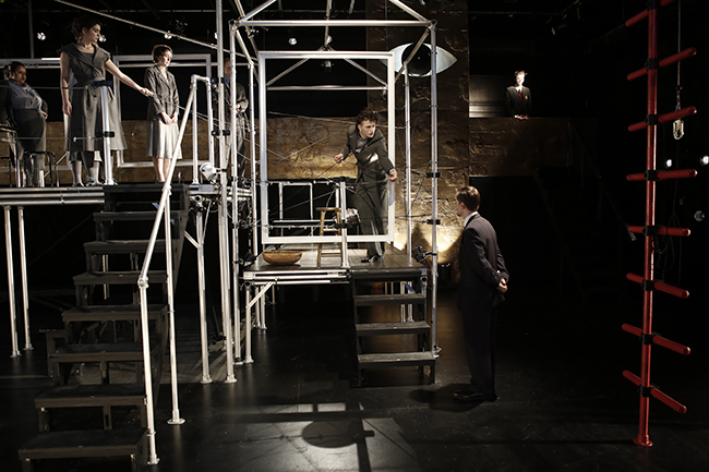 The set design is a construction scaffold. It really has the look of a bombed war-torn city or house within it. The space below becomes a bomb shelter, an entrance, an exercise room, and a throughway, among other things. The second level consists of rooms with window frames pushed up by the actors so we are looking in watching them or or they are watching events below including us. One can see several rooms at times. I love the way one's imagination can take off and fill in details. Spare and simple. No technological overkill. There is also a clear division of social class.